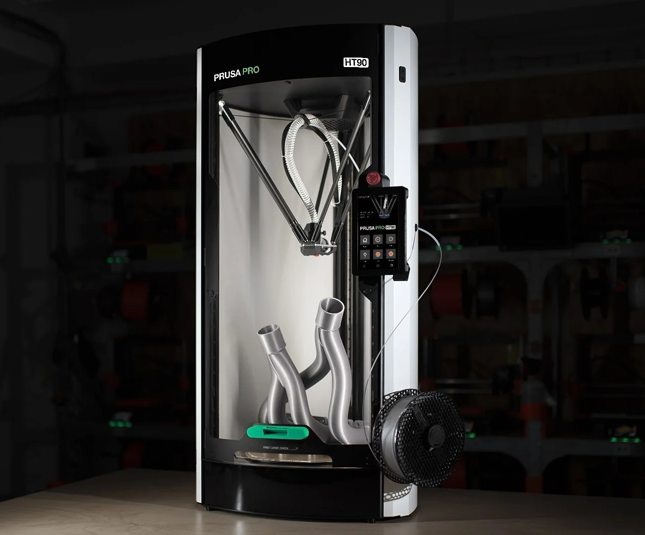Specifications: 5 print heads, segmented heatbed, 0.05-0.30 mm layer height, 360x360x360 mm build volume.
