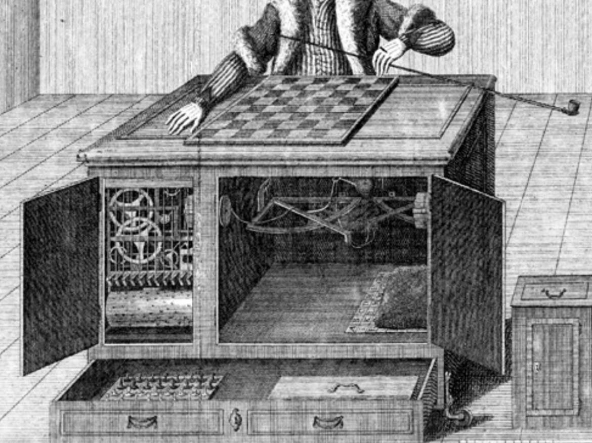 The board is modeled after the automated Chess Player - the first 'artificial intelligence' machine created in 1770. The entire world was gripped by this machine which could autonomously play chess againt grandmsters, yet in reality a small person inhabited the cavity below the table and moved the pieces via magent. Hence, our ouija xy-gantry of cursors and magents was born.